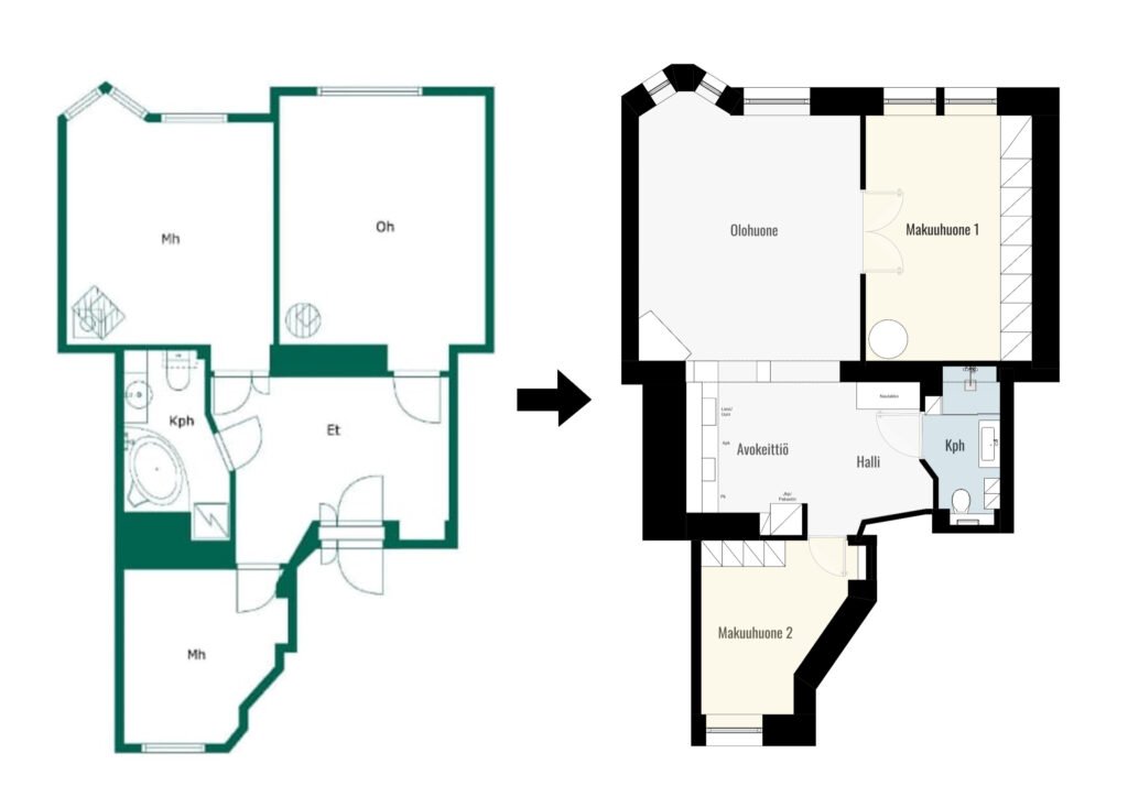 Professional service that truly respected our wishes. The project was a 27m² studio apartment that originally lacked both a bathroom and a kitchen. The result is a compact and functional home. Highly recommended! -Jari